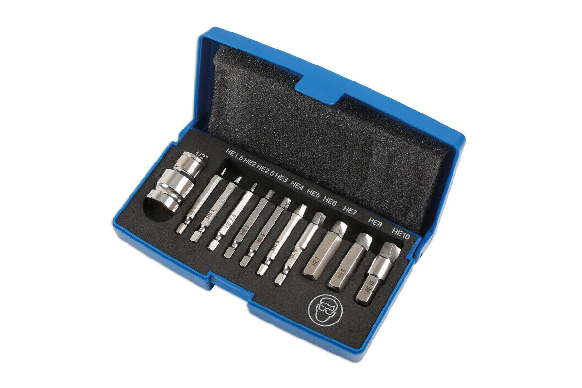 Damaged Hex Cap Head bolt and screw extractor set 1/4″ Hex shank: 1.5mm, 2mm, 2.5mm, 3mm, 4mm, 5mm, 6mm and 10mm Hex shank: 7mm, 8mm, 10mm. 1/2″D x 10mm Hex bit adaptor For removing damaged hex bolts and screws